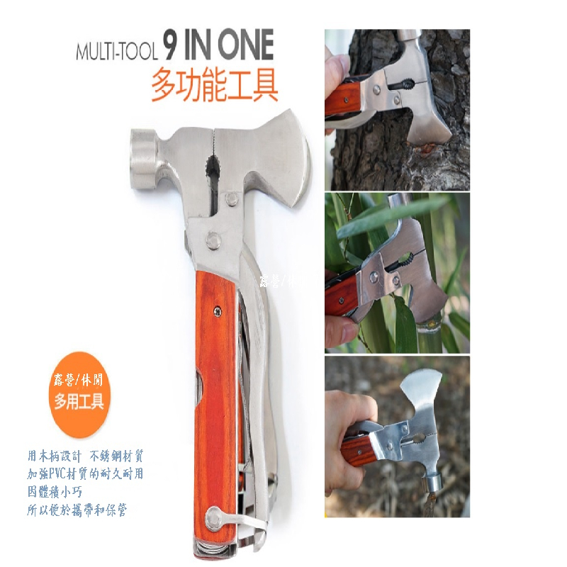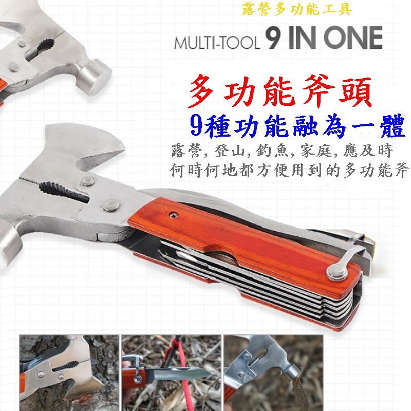 特色:採用優質不鏽鋼製作,經久耐用。木把手手感舒適,使用方便。一把工具9種用途,是居家、戶外好幫手,附收納袋,攜帶方便主要工具:切線鉗、十字螺絲刀、鋼刀、鋸刀、手斧、開瓶器、一字起子、平口鉗、錘子