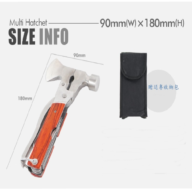 採用優質不鏽鋼製作,經久耐用。木把手手感舒適,使用方便。一把工具9種用途,是居家、戶外好幫手,附收納袋,攜帶方便主要工具:切線鉗、十字螺絲刀、鋼刀、鋸刀、手斧、開瓶器、一字起子、平口鉗、錘子