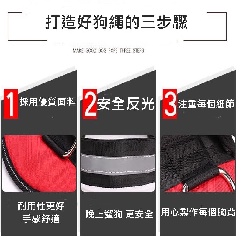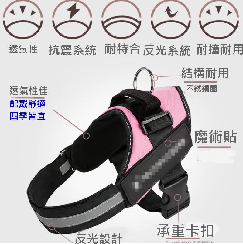 質感好的胸背帶,採用加厚、柔軟、抗拉、耐磨、的尼龍材質金屬釦環是高強度合金材料,經過嚴謹的防酸電鍍處理,避免生鏽。承受拉力強,防掙脫、暴衝可搭配牽繩牽,也可直接手拉,非常方便。重型插扣,再也不怕狗狗意外掙脫了。