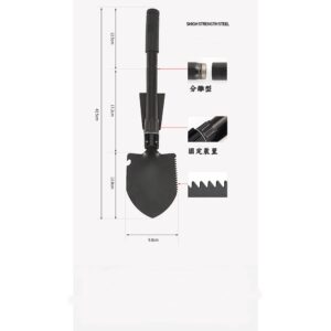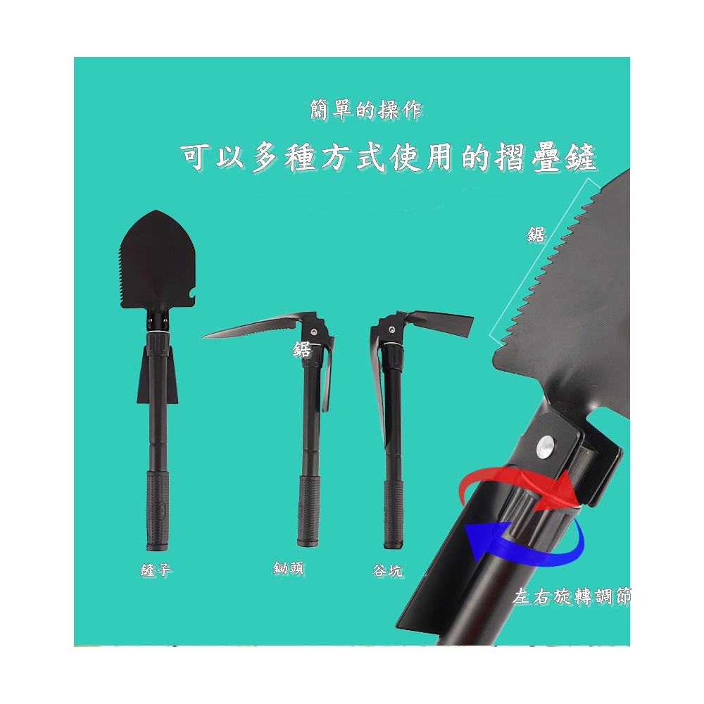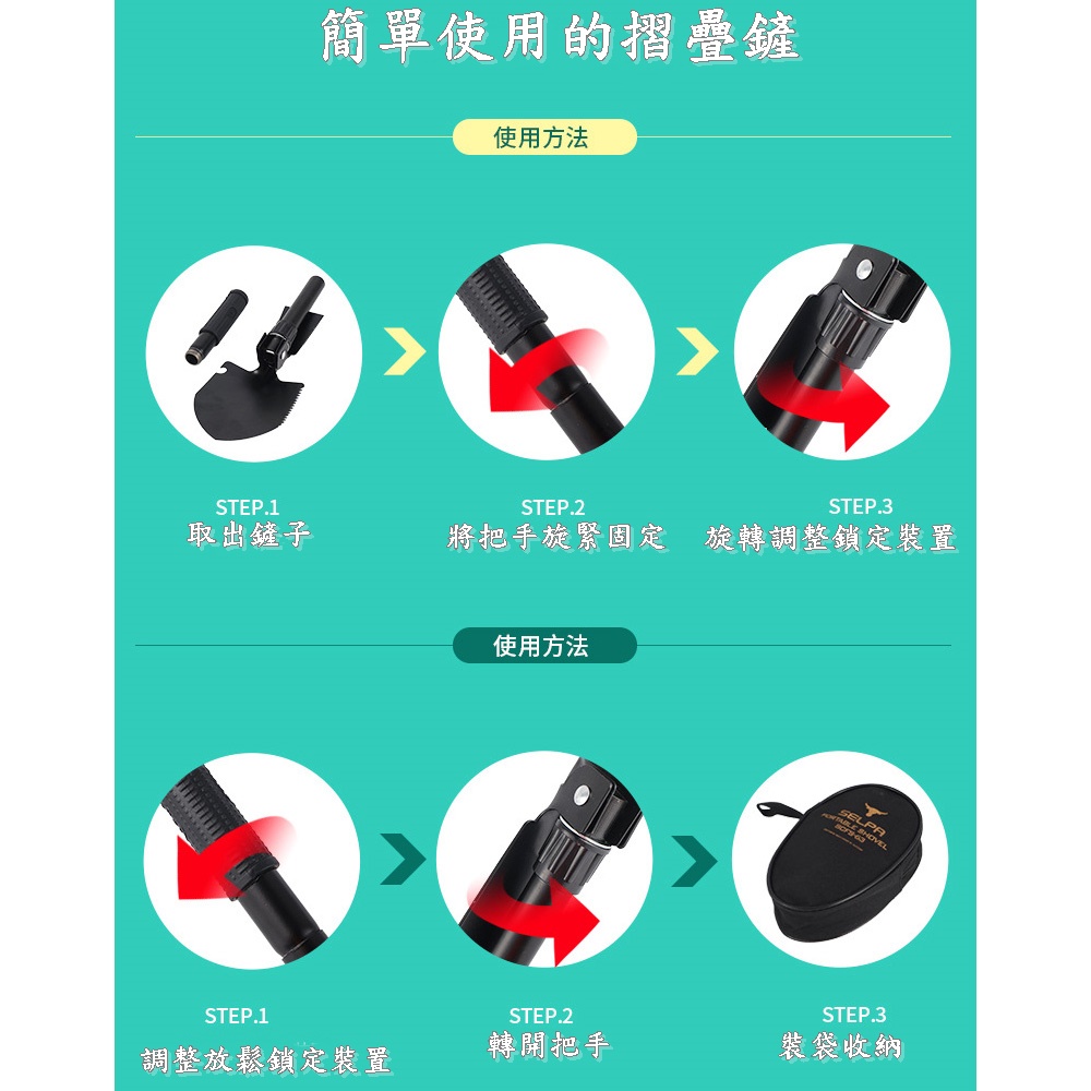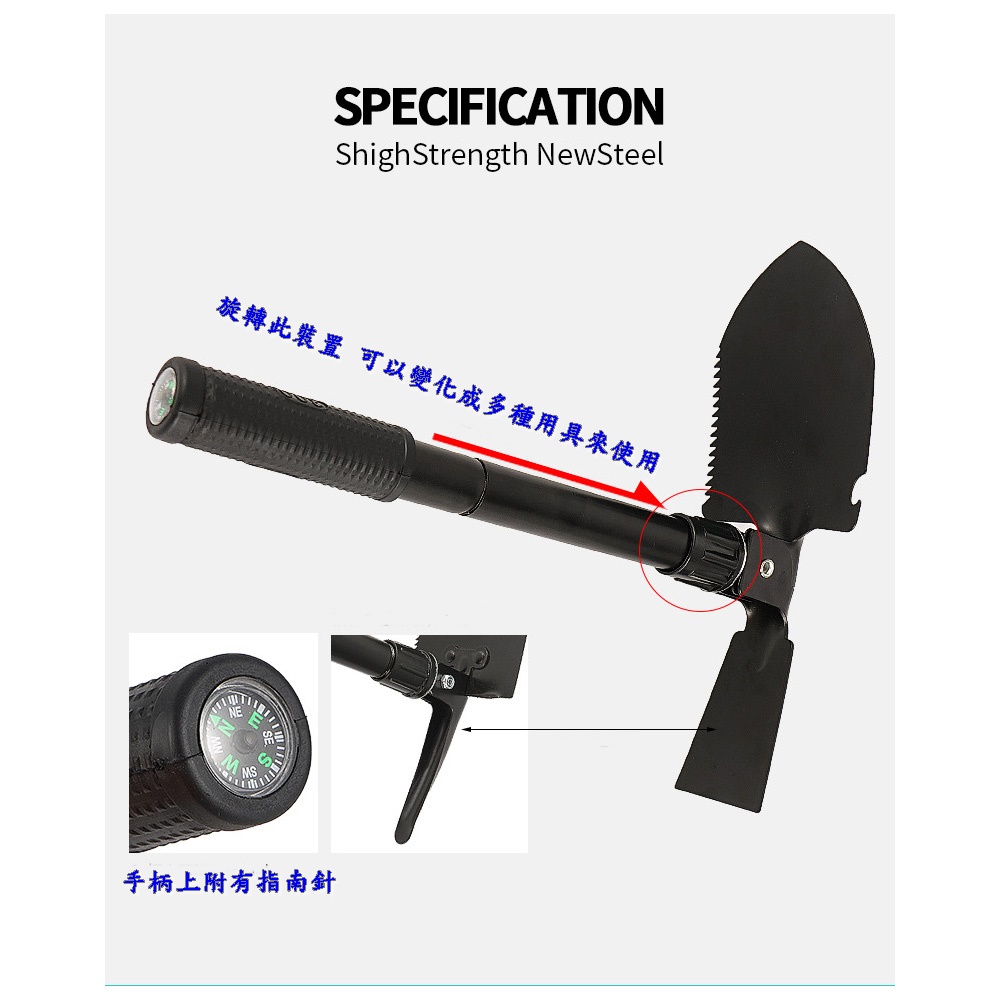 這款便攜鐵鏟,收納體積非常小,功能卻很多。可以當鐵鏟,另一邊是鐵鍬,鐵鏟的邊緣是鋸齒狀還可以臨時充當鋸子用。柄底還藏著一顆指北針。