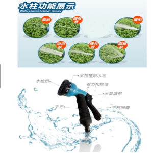 水管長度:7.5M (水壓達2.5公斤延伸長至15M)水管重量:約700g六段水槍重量:約145g